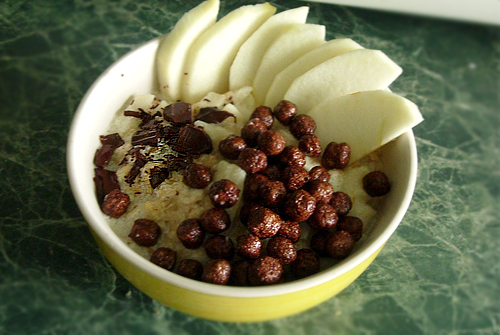 Manna z ubitym białkiem, crunchy z granatem, serek wiejski, mieszanka kompotowa